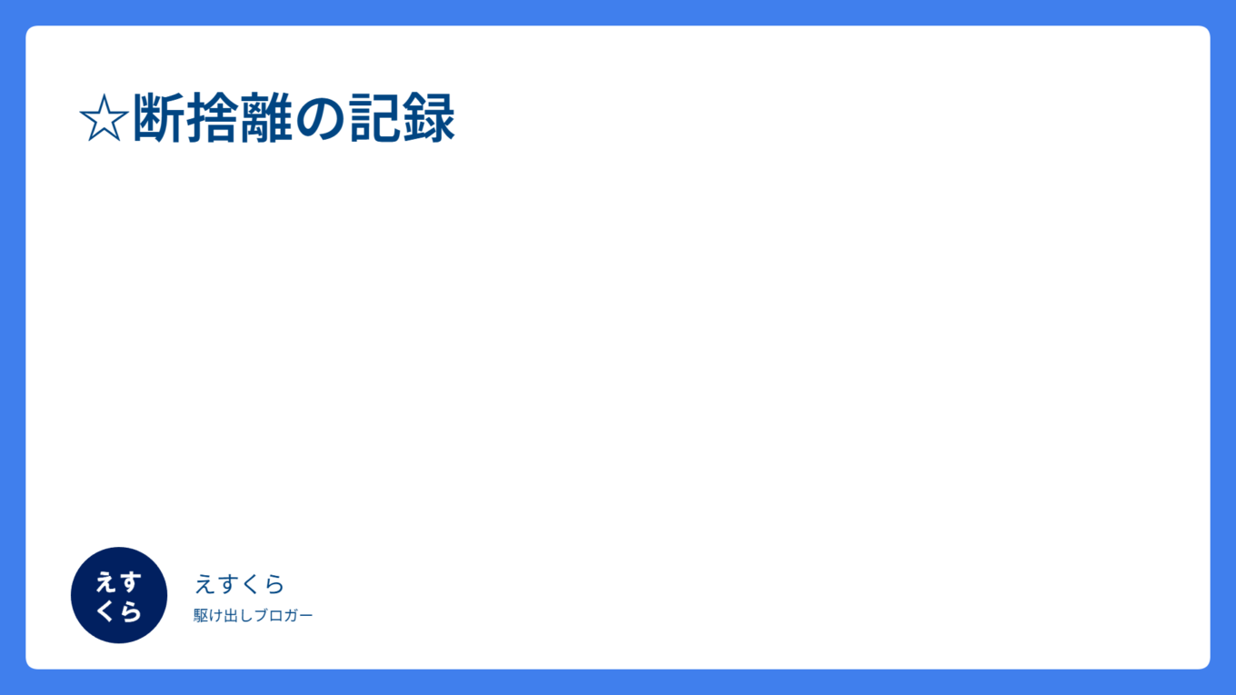 新着記事News ◇2025年にやりたいこと 2025.10.13 やりたいこと ☆断捨離の記録 2025.10.12 断捨離 #6 服のリフォーム|マジックミシン 2025.08.24 服 やりたいこと 断捨離 服 人気記事Popular Post ◇2025年にやりたいこと 2025.10.13 やりたいこと #1 【結論】XSサイズの服 販売店 43 views #4 その他小物たち 27 views #5 ユニクロ「オンラインストア」での購入のコツ 23 views #2 普段着のすべて 20 views #3 仕事着のすべて 8 views #6 服のリフォーム|マジックミシン 6 views えすくら駆け出しブロガーProfile「持たない暮らし」に憧れる小柄男子。 貴重なXSサイズの服やアイテムを大切に着続けるうちに、最小限のお気に入りのアイテムに囲まれるミニマリスト生活に目覚める。 「持たない暮らし」を実現すべく、アイテム厳選・断捨離に奮闘中。プロフィールを読む